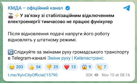 У столиці зупинили роботу фунікулера через стабілізаційні відключення