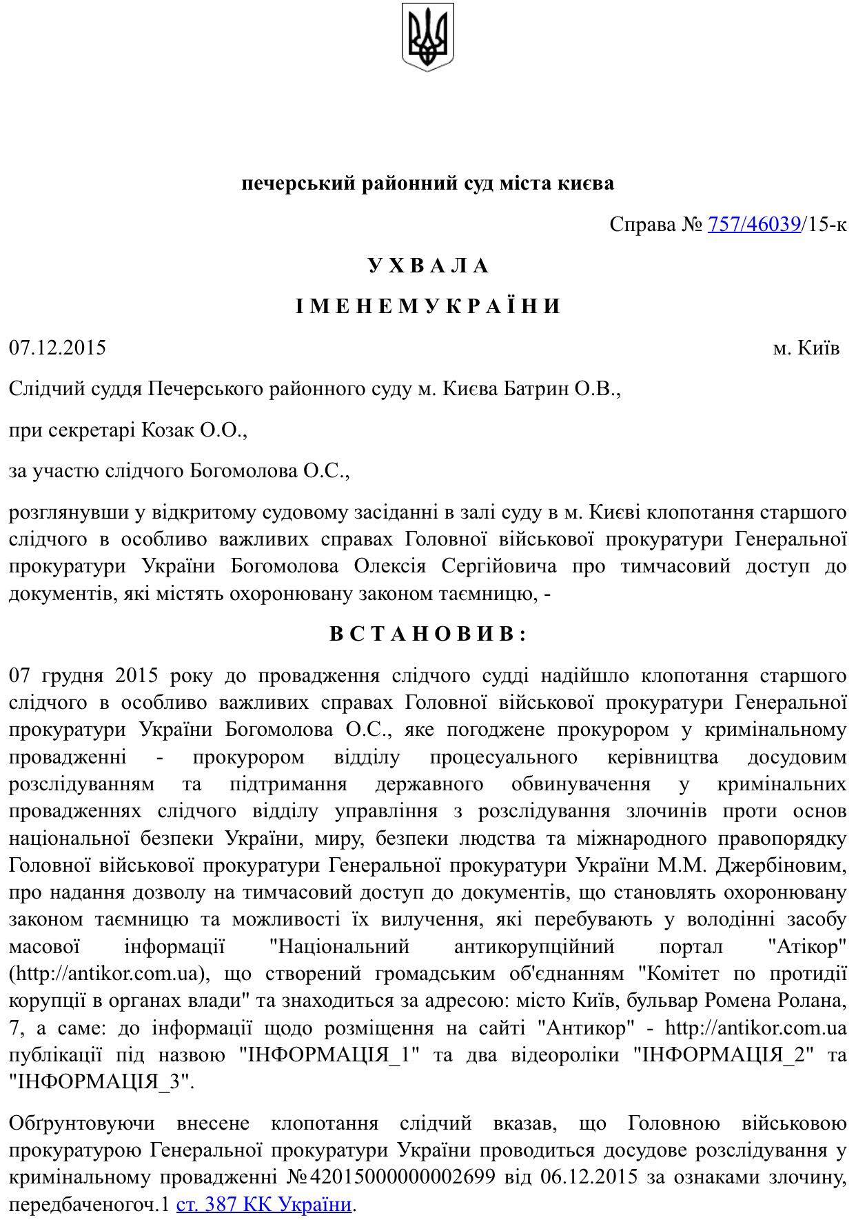 Печерский суд выдал старшему следователю по особо важным делам Главной военной прокуратуры Генеральной прокуратуры Украины Богомолову Алексею Сергеевичу разрешение на временный доступ к документам, которые содержат государственную тайну.