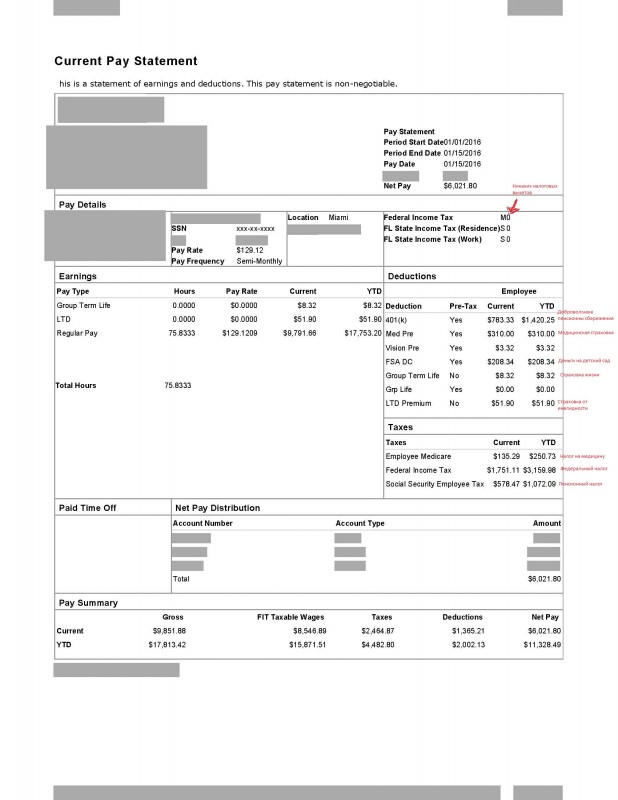 Также, есть отчисления на страхование жизни ($8.32 дает страхование в две годовых зарплаты, в случае смерти) и страхование от потери трудоспособности ($51.90 дает 60% от зарплаты, пожизненно, в случае потери трудоспособности). Но эти деньги на самом деле не вычитаются из зарплаты, так как за это платит работодатель. Они сначала прибавляются к зарплате, а затем вычитаются. В итоге, работник платит лишь налоги, что уже включено в сумме налогов выше. Еще есть глазная страховка, которая оплачивает очки или контактные линзы, но это уже мелочь - $3.32.