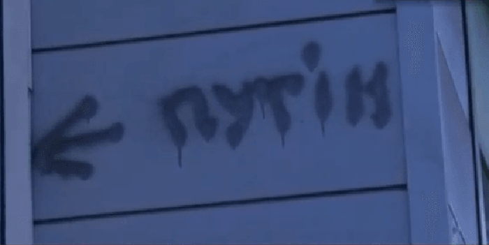 Отдельные активисты испортили фасад здания. Они написали на помещении «Путин» и «Бизнес оккупанта».