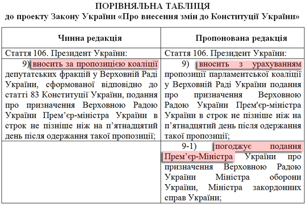 Перш за все щодо призначення голови уряду. Згідно з діючою Конституцією, кандидатуру прем’єр-міністра на розгляд парламента президент вносить "за пропозицією коаліції депутатських фракцій". В редакції ж Петра Порошенка вказано, що кандидатура голови уряду вноситься президентом "з урахуванням пропозиції парламентської коаліції".