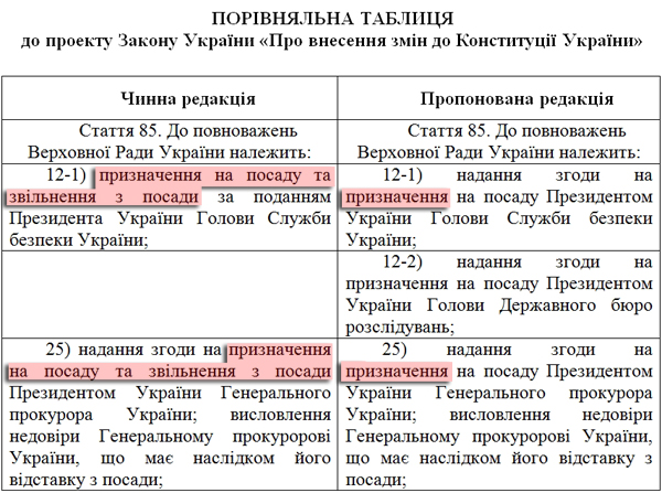 Остаточно кадрові привілеї закріплені у розділі про повноваження голови держави, де право президента на звільнення голови СБУ та Генпрокурора чітко відокремлені від необхідності надання згоди з боку Верховної ради.