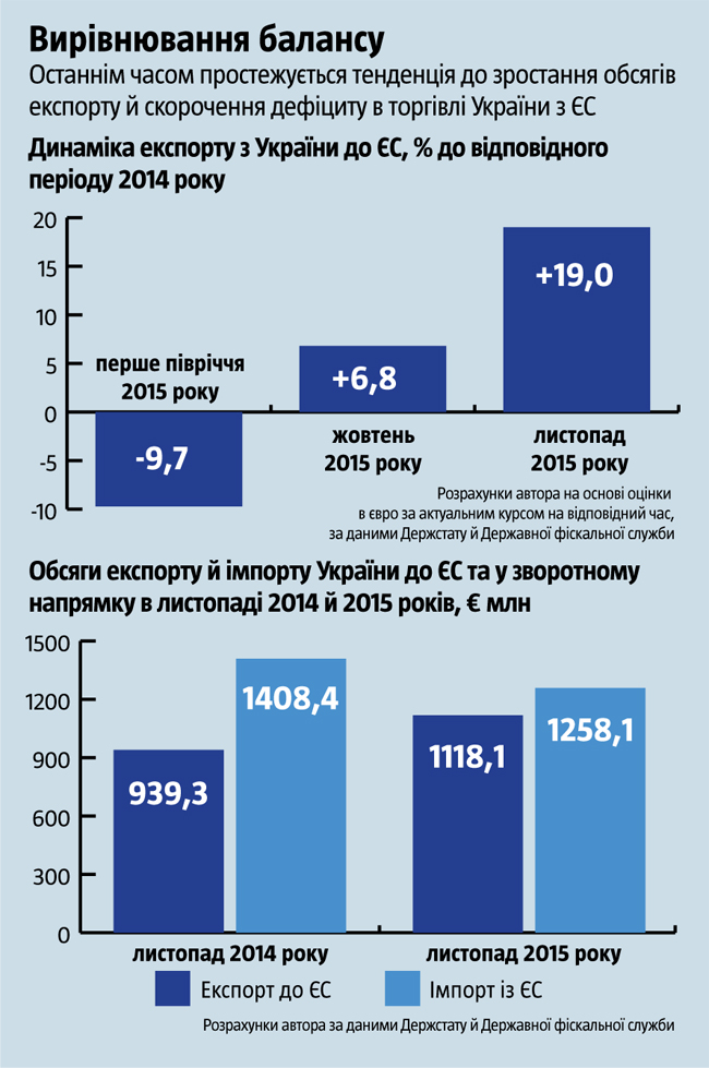 Привлекает внимание тот факт, что на фоне роста нашего экспорта в Евросоюз в последнее время произошло существенное улучшение торгового сальдо для Украины, а дефицит торговли медленно стремится к нулю. В ноября 2014 года экспорт в ЕС составил $1171,53 млн при импорте в $1756,28 млн, то есть был почти в полтора раза меньше. В первом полугодии 2015 года соотношение составляло уже $6062,8 млн к $7389,9 млн, то есть наши поставки уступали ввозу из ЕС на 22%. А в ноябре 2015 года европейские продажи в Украину только на 12,5% превысили объем украинского экспорта в ЕС ($1199,75 млн против $1349,93 млн).
