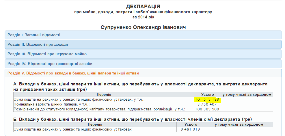 В отличие от коллеги Лукьянчука, Александр Супруненко в 2013-м задекларировал целое состояние. Миллион долларов (22 миллиона гривен). Почти вся эта сумма содержится в графе "материальная помощь". Спустя год Супруненко добавил к материальной помощи еще 100 миллионов гривен - и отнес их в графу "банковские счета".
