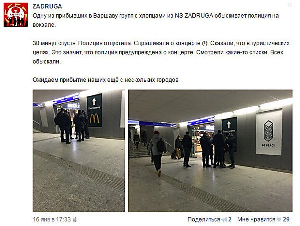 При цьому одну з груп російських нацистів зупинила на вулиці польська поліція, але опитала, обшукала і спокійно їх відпустила. При цьому поліцейські були обізнані, що росіяни йдуть на концерт “правої” групи.