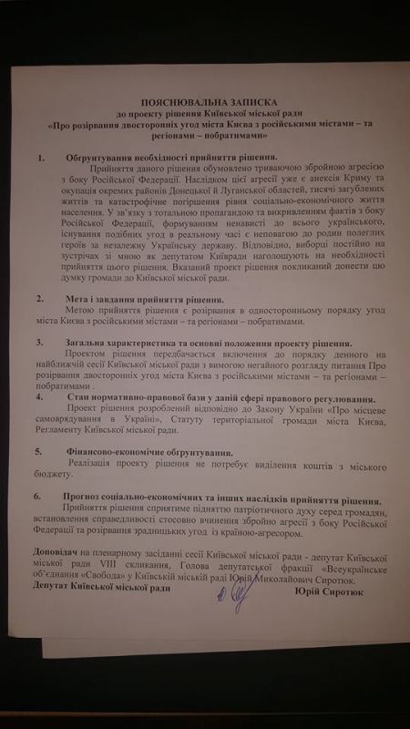 Фракція ВО "Свобода" у Київраді вносить проект рішення про невідкладне розірвання двосторонніх угод про "побратимські відносини" Києва з російськими містами та регіонами