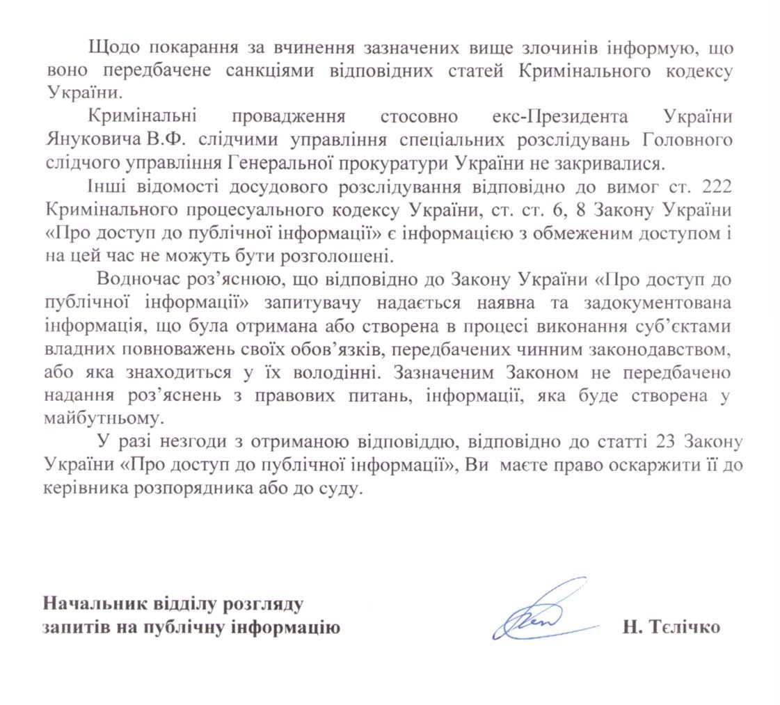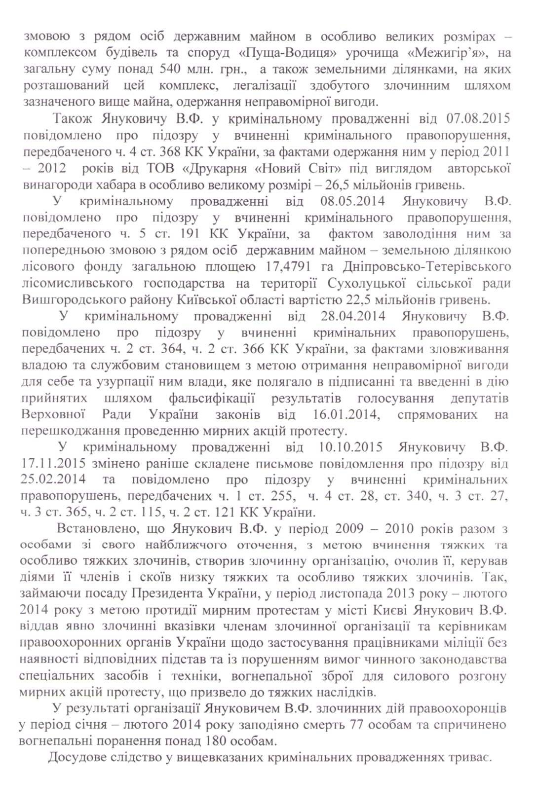 У кримінальному провадженні від 10.10.2015 Янукович підозрюється у кримінальних правопорушеннях за ч. 1 ст. 255 (створення злочинної організації, керування нею), ч. 4 ст. 28 (злочин, вчинений організацією з трьох і більше осіб), ст. 380 (невжиття заходів щодо осіб, взятих під захист), ч. 3 ст. 27 (організація злочину, підготовка і вчинення злочину), ч. 3 ст. 365 (перевищення службових повноважень), ч 2 ст 115 (умисне вбивство двох і більше осіб), ч. 2 ст. 121 (умисні фізичні каліцтва) ККУ.