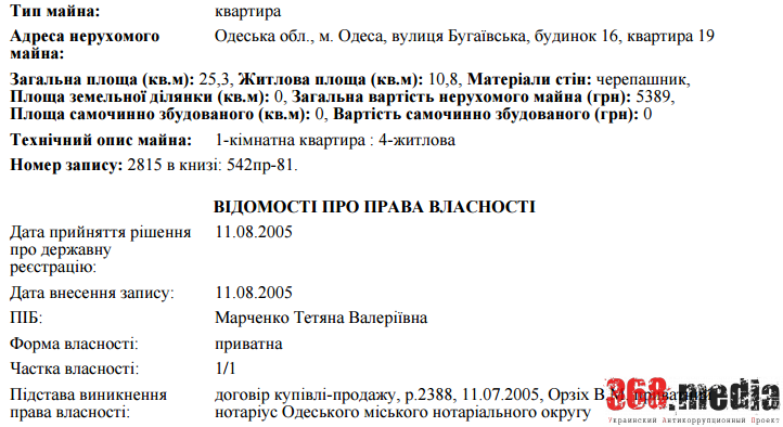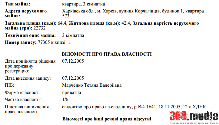 Отметим, что на человека с похожей ФИО зарегистрировано несколько объектов недвижимости в разных концах Украины. Квартира в 25,3 кв. метра находится в Одессе на улице Бугаевская, 16. Еще одна трехкомнатная квартира (64,4 кв. метра) в Харькове получена в наследство в 2005 году. Кроме того, на некую Татьяну Марченко в 2013 году зарегистрирован дом в Нежине на улице Циолковского, 26.