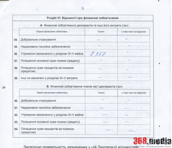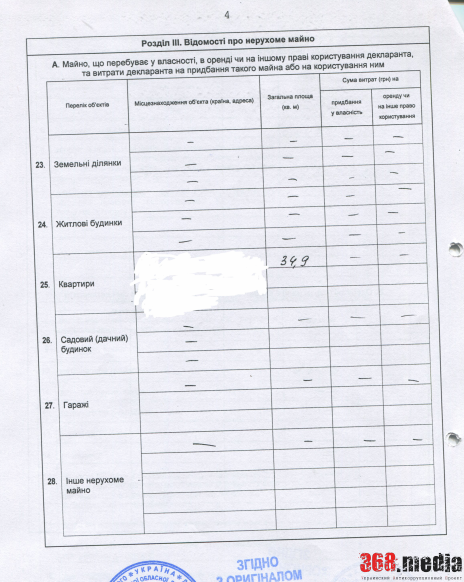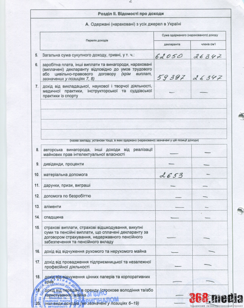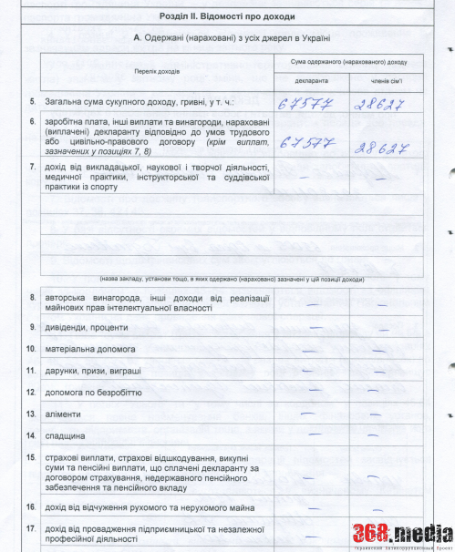 В 2013 году зарплата чиновника составила 59,3 тыс. гривен Еще 2,6 тыс. гривен она получила в виде матпомощи. Ее супруг и ребенок заработали 26,3 тыс. гривен. Из недвижимости у семьи есть только одна квартира (34,9 кв. метра).