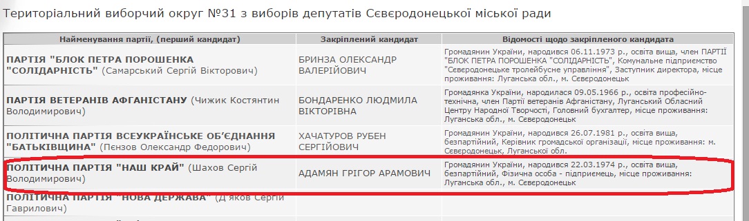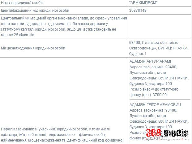 Интересно, что Адамян Артур Арами – личность, достаточно известная в Северодонецке Луганской области. Он является учредителем фирм «Укрэнергогрупп», НПП «Северодонецкий завод сопротивлений» и «Рименд». Кроме того, он является членом «Радикальной партии Олега Ляшко» и даже баллотировался в Одесский горсовет под четвертым номером в списке, но не прошел. Его родственник в 2015 году баллотировался в Северодонецкий горсовет от партии «Наш край».