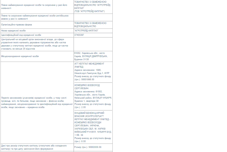 Итак, как видно из Государственного реестра юридических лиц и физических лиц, учредителем фирмы «Агротрейд капитал» является кипрская компания АКГ КЕПИТАЛ МЕНЕДЖМЕНТ ЛИМИТЕД (99.99%), кроме этого, в учредителях значится и Кожемяко Всеволод Сергеевич, известный в Харькове «решала» и спонсор местного отделения «Самопомощи». При этом конечным бенефициаром компании АКГ КЕПИТАЛ МЕНЕДЖМЕНТ ЛИМИТЕД является все тот же Всеволод Сергеевич Кожемяко. Совершенно очевидно, что эта схема используется для уклонения от налогов путем выведения огромных сумм через конвертационные центры за рубеж. Кстати, согласно статистике, ежегодно из Украины нелегально выводится в среднем 11,676 миллиардов долларов. Несложно представить объемы теневых оборотов «Агротрейда», при том что зернотрейдерский рынок занимает немалую долю в экономике страны.