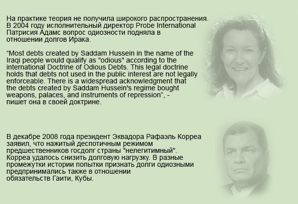 Одиозный долг – долг, взятый властью не во благо народа, а в собственных целях. Согласно юридической теории, он считается долгом режима, а не государства, и не подлежит возвращению после смены власти.