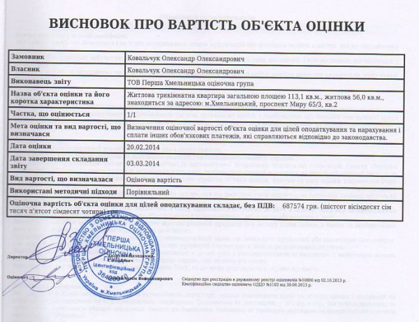 1 20.02.2014 ТОВ “Перша Хмельницька оціночна група” 687 574 грн