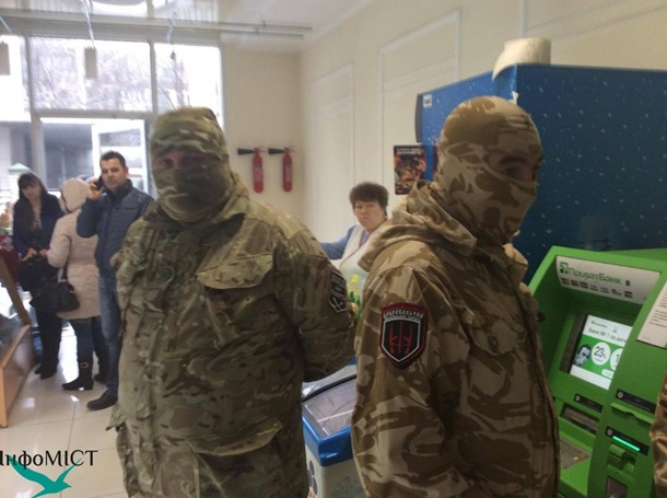 Накануне организация анонсировала акцию в Facebook. В отделении находятся мужчины в камуфляже и масках, которые не пускают посетителей. Им говорят, что банк сегодня не работает. Из-за этого возле отделения собралась очередь, и клиенты возмущаются действиями ПС.