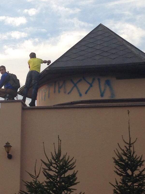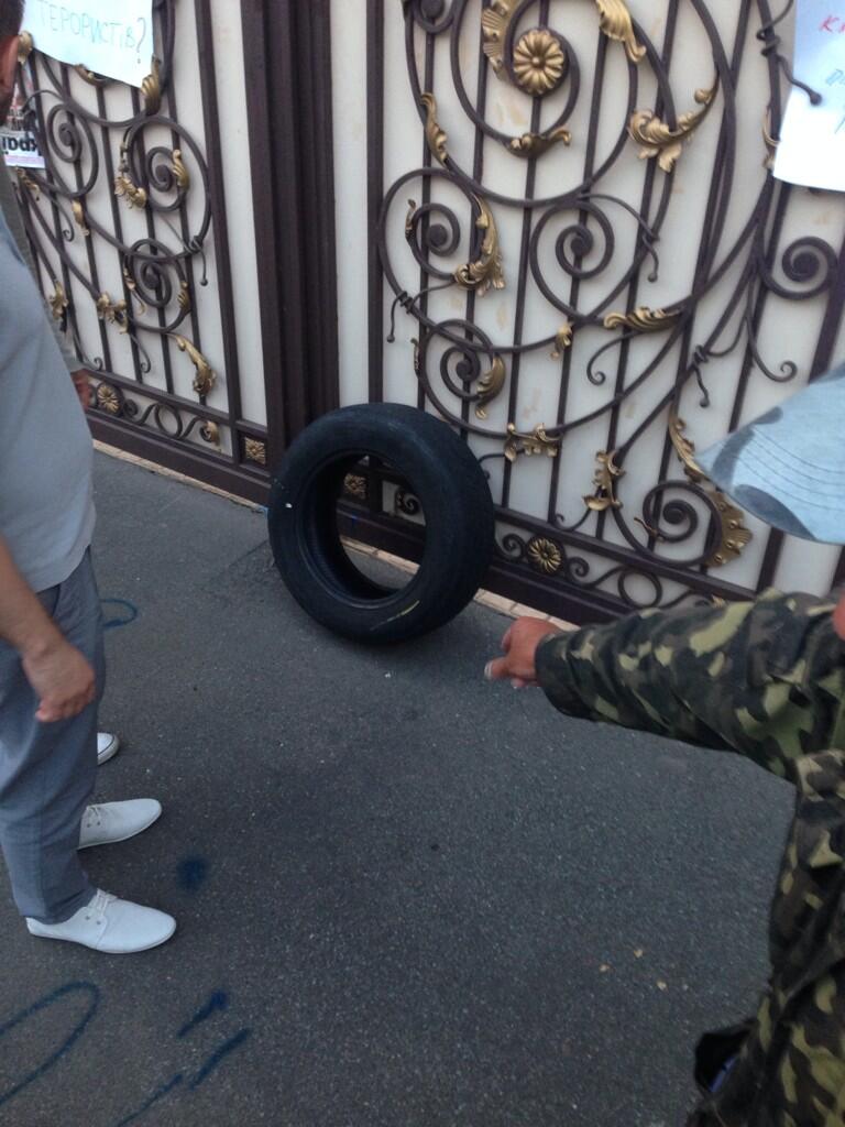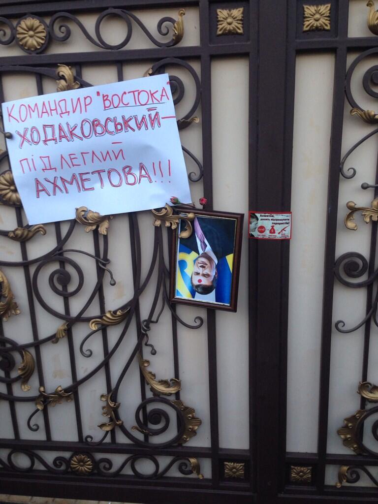 Люди приїхали висловити свій протест через підтримку Ахметовим сепаратистів на Донбасі. За повідомленнями очевидців подій, остання частина дороги до маєтку заблокована КАМАЗами. Люди добираються пішки.