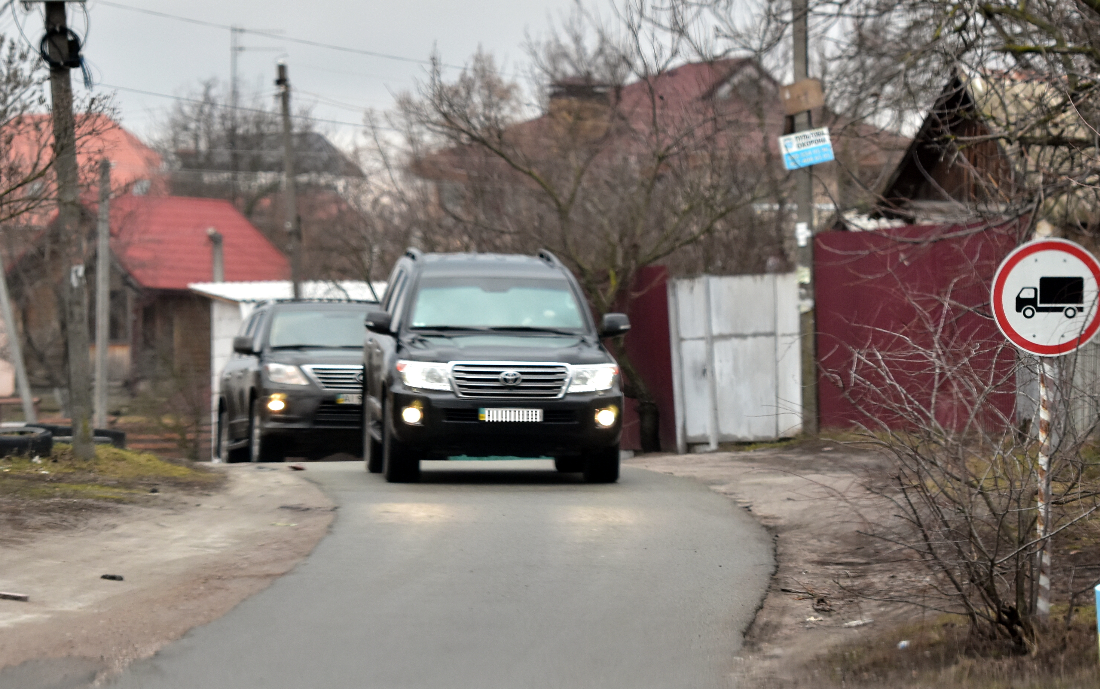 В будний день фотокорреспондентам "Страны" удалось застать генпрокурора дома в 9 утра. Незадолго до его выезда на работу, территорию вокруг его имения под Киевом промониторила машина с сотрудниками госохраны. У бойцов мы рассмотрели автоматы. Увидеть, что в это время происходило во дворе не удалось из-за камуфляжной сетки поверх трехметрового забора. Через 5 минут из ворот выехал кортеж Шокина: внедорожник Toyota Land Cruiser и Lexus LX 570 - самый мощный в линейке этой японской марки. При чем, толстый ободок на лобовом стекле первого авто свидетельствует о бронезащите. Такой пуленепробиваемый джип доставляют в Украину за 6 млн грн.