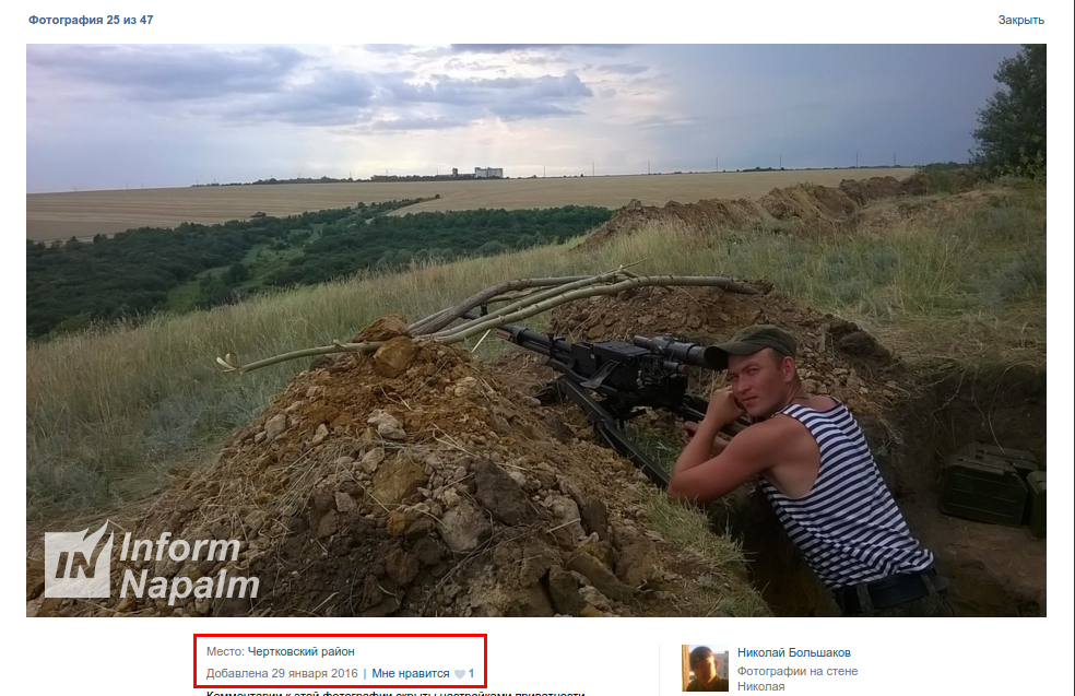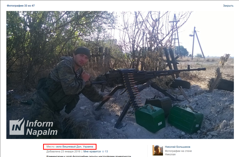 В продолжение темы участия российских регулярных военных подразделений в необъявленной войне против Украины волонтеры представили убедительные фотодоказательства присутствия на Донбассе военнослужащего 61-й бригады морской пехоты Северного флота ВМФ РФ (в/ч 38643 УФ, сел. Спутник, Мурманская область) Николая Большакова. О том, что Николай является действующим военнослужащим морской пехоты и служит в сел. Спутник говорят фотографии, размещенные в его фотоальбоме. Примечательно, что последняя фотография была загружена 2 марта 2016.