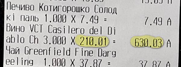Фрагменты чека - маркером выделена стоимость бутылки вина