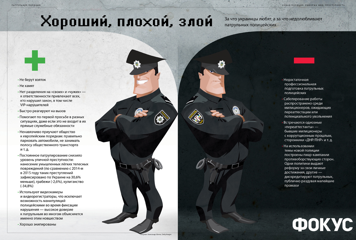 Они не избегали проблемных тем, честно признаваясь, что с ними действительно не подписали давно обещанных контрактов, выдали только один комплект летней формы и вообще не выдали зимней. Что им часто приходится перерабатывать без каких-либо доплат. Что они ещё не проходили курсов экстремального вождения. Что борьба с бюрократией в Департаменте патрульной полиции идёт вяло и неэффективно. Что премии и штрафы распределяются ротными, из-за чего размер зарплаты патрульного часто напрямую зависит от того, в каких отношениях он находится с ротным. Но всех сотрудников патрульной полиции, с которыми общался Фокус, объединял оптимизм по поводу будущего их ведомства. В этом они существенно отличаются от многих сотрудников старой милиции, часто исполненных фатализма и безразличия к интересам общества.