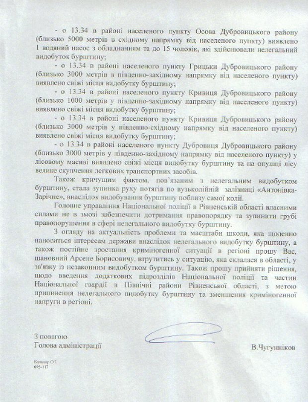 Глава Ровенской областной государственной администрации Виталий Чугунников обратился к министру внутренних дел Арсену Авакову с просьбой ввести в северные районы области войска Нацгвардии, чтобы остановить незаконную добычу янтаря.