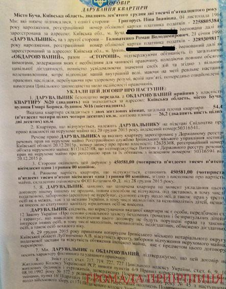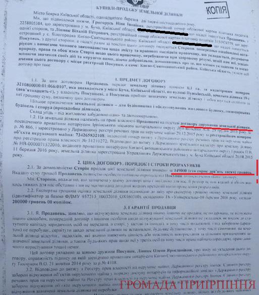 До редакції “Громади Приірпіння” потрапив договір купівлі-продажу, укладений між Ніною Григорусь та забудовником Віталієм Лінником. Сума, на яку укладений договір, занижена щонайменше у 10 разів. Складає вона 149 тисяч гривень за 10 соток землі в лісі.