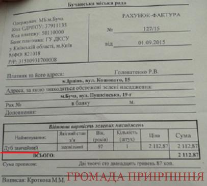 З документів забудовники показали рахунок-фактуру – трохи більше 2-х тисяч гривень, сплачених за зняття одного дерева – дуба.