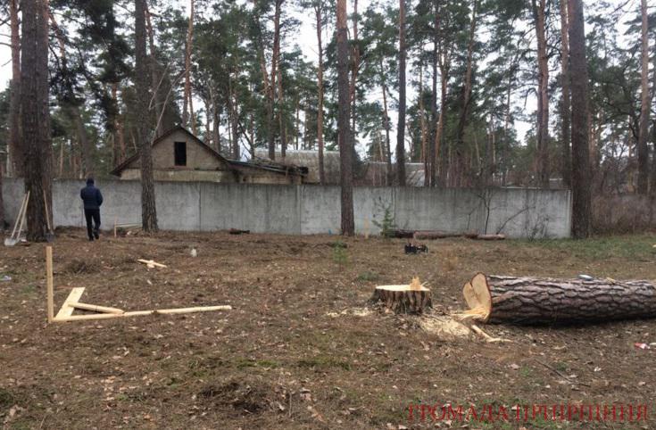 “Вранці ми почули, що десь недалеко від нас працюють бензопилки. Ми пішли подивитися, що відбувається. На земельній ділянці біля нежилого будинку невідомі пиляють сосни. Вирішили поцікавитися на якій підставі вони це роблять. При нас упала сосна”, – розповідає бучанка Ірина.