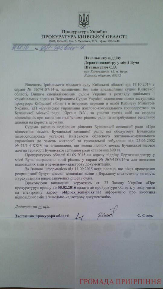 Прокуратура Київської області неодноразово зверталася до Дергеокадастру в місті Буча з проханням внести зміни категорії земель, згідно з Постановою Верховного Суду України, що унеможливить виділення землі в лісі.