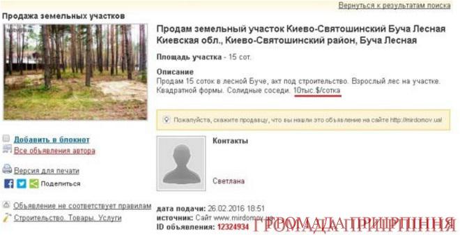 “По цій земельній ділянки я вбачаю дві складові, за якими має бути притягнутий до кримінальної відповідальності голова депутатської земельної комісії та депутат Бучанської міської ради Микола Григорусь. Перше, як голова земельної комісії він не мав права виносити на розгляд комісії та готувати проекти рішень на сесію щодо надання земельних ділянок із земель Державного лісового фонду. Так, згідно з ухвалою Вищого спеціалізованого суду, яка набрала законної сили з 29 липня 2015 року, такі дії є незаконними. До слова, Постанова Верховного Суду України підтвердила ухвалу Вищого спецсуду”.