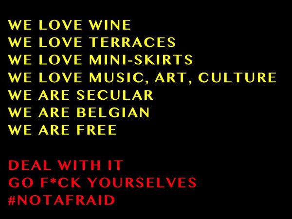 Сейчас главной задачей для жителей Бельгии и всей объединенной Европы является преодоление страха перед террористической угрозой. Задача эта сложная, но судя даже по первой реакции жителей Бельгии — посильная. Это выражает моментально появившийся в сети хештег #notAfraid (т.е. не бояться).