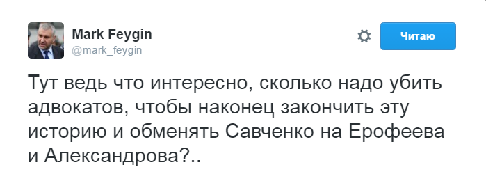 В свою очередь Марк Фейгин задался вопросов, сколько еще адвокатов убьют, прежде, чем закроют дело Савченко и задержанных в Украине ГРУшников.