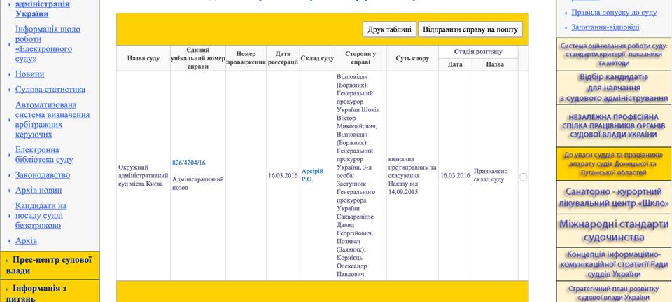 «Мне стало известно о том, что 14.04.2016 Окружной административный суд Киева рассмотрит иск об отмене приказа ГПУ о назначении на должность замгенпрокурора Сакварелидзе. Мною подан аналогичный иск 16.03.2015, однако дата заседания не определена», — говорится в сообщении.