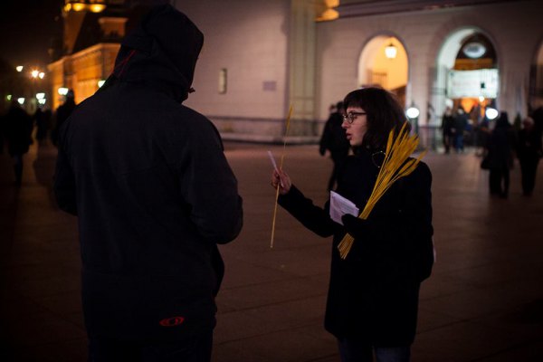 28.11.2015. Акція активістів Фундації "Євромайдан-Варшава" до річниці Голодомору в Україні. У центрі Варшаві роздавали листівки про Голодомор та колоски, як символ цього страшного дійства. (Фото з ФБ-сторінки Euromaidan-Warszawa)