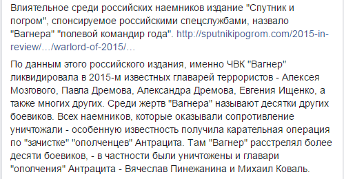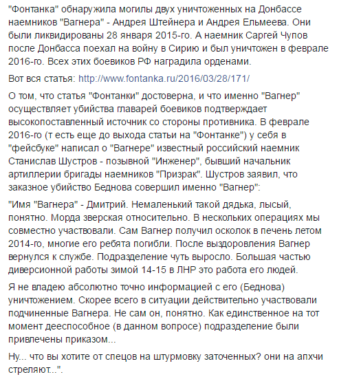 "В нескольких операциях мы совместно участвовали. Сам Вагнер получил осколок в печень летом 2014-го, многие его ребята погибли. После выздоровления Вагнер вернулся к службе. Подразделение чуть выросло. Большая частью диверсионной работы зимой 14-15 в ЛНР это работа его людей. Я не владею абсолютно точно информацией с его (Беднова) уничтожением. Скорее всего, в ситуации действительно участвовали подчиненные Вагнера. Не сам он, понятно. Как единственное на тот момент дееспособное (в данном вопросе) подразделение были привлечены приказом... Ну... что вы хотите от спецов на штурмовку заточенных? они на апхчи стреляют...", - написал Шустров.