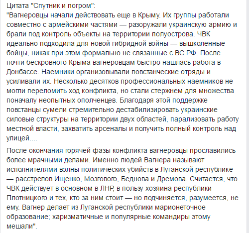 "ЧВК в роли ВЧК. В "ЛНР" "Вагнер" главный инструмент власти российского командования на Донбассе. Частная военная компания - ЧВК, выполняет функции большевистского ВЧК, уничтожая всех "меньшевиков". И держит в страхе всех, кто не хочет делиться или посягает на ресурсы Плотницкого", - говорится в тексте.