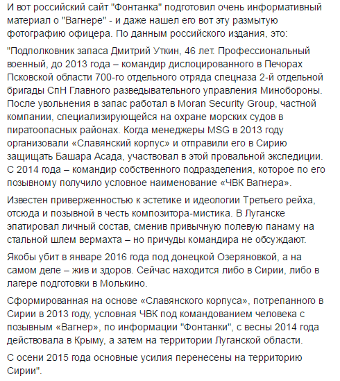 По словам Бутусова, хоть сейчас Уткин и находится в составе российского военного контингента в Сирии, его подопечные продолжают держать в страхе верхушку бандформирований "ДНР" и "ЛНР". В материале говорится, что военнослужащие секретного батальона "Вагнера" являются одними из тех самых "зеленых человечков", при помощи которых Россия провела военную интервенцию в Крыму.