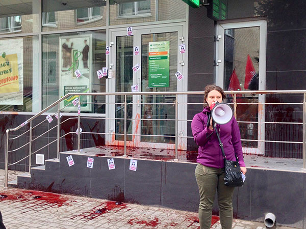 Для ефектності акції вхід у відділення банку облили кров’ю тварин.