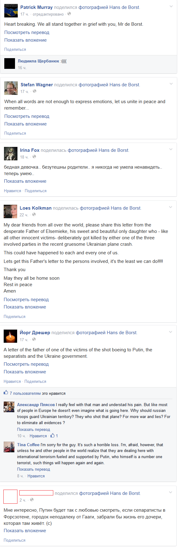 Среди комментариев пользователей можно отметить следующие фразы: - эти слова разрывают сердце, разделяем Ваше горе, мистер де Борст; - не хватает слов, чтобы выразить эмоции. Давайте объединимся в мире и будем помнить всех жертв; - бедная девочка, безутешные родители. Я никогда не умела ненавидеть, теперь умею; - мои милые друзья из всего мира, давайте распространим это письмо от безутешного отца Элсемик. Его любимая, единственная дочь, так же как и другие невинные жертвы, находилась в самолете, преднамеренно сбитом одним из трех виновников, обозначенных в послании. Донести это послание к виновным лицам – это меньшее, что мы можем сделать. Спасибо. Пусть в ближайшее время тела жертв прибудут на Родину и упокоятся в мире; - письмо от отца одной из жертв сбитого Боинга, адресованное Путину, сепаратистам и украинскому правительству; - я действительно сочувствую этому человеку и понимаю его боль. Но, как и большинство людей в Европе, он не представляет, что происходит на Украине. Почему он просит, чтобы российские военные охраняли место происшествия? Те самые, кто и стрелял в самолет? Чтобы еще больше врать или накалять обстановку или чтобы они уничтожили все доказательства своей вины?