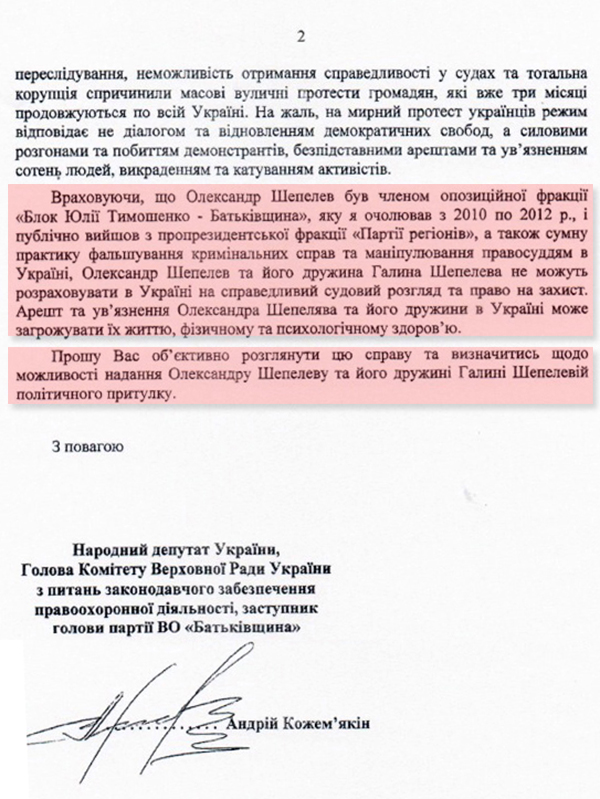 Документ, который нам передали – это обращение на имя премьер-министра Венгрии Виктора Орбана с просьбой предоставить Александру Шепелеву и его супруге политическое убежище. Обращение подписано главой фракции Батькивщины Андреем Кожемякиным в самый разгар Майдана – 2 февраля 2014 года.