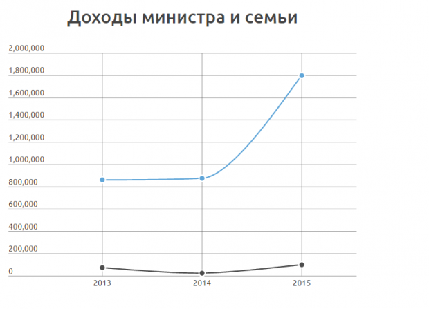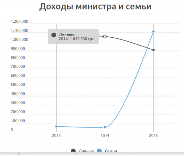На графиках большинства членов правительства Яценюка прекрасно видна удивительная закономерность роста дохода семей топ-чиновников с 2013 по 2015 год. Наиболее показательным является график доходов сохранившего должность министра молодежи и спорта Игоря Жданова. На фоне двукратного падения его собственных доходов с 219 тыс. гривен в 2013 году до 99 тыс. в 2015-м, семья стала зарабатывать в 9 раз больше: 31 тыс. грн в 2013 году и 284 тыс. - в 2015 году.