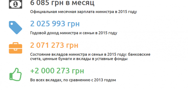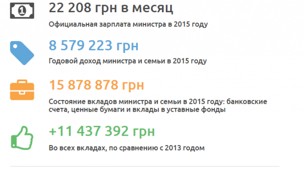 Но все эти трудности не только не сказались на благополучии министров и их семей, но и проходили на фоне их стремительного обогащения. Из всего Кабмина Яценюка, состоящего из 17 министров, лишь четверо задекларировали ухудшение своего финансового состояния, в то время как остальные отчитались про миллионные вклады и стремительный рост доходов, если не своих личных, то членов семей. Например, вклады в уставные фонды компаний, банковские счета и ценные бумаги экс-премьер-министра Арсения Яценюка возросли за время премьерства на 14 миллионов гривен.