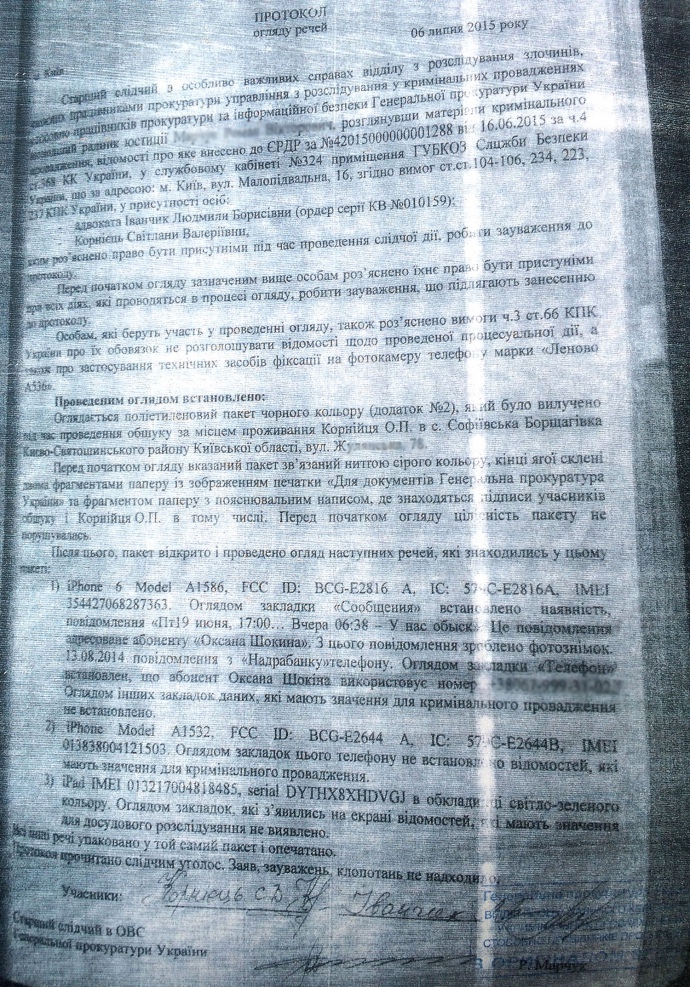 У пакеті також лежав телефон iPhone 6, який, за документом, належить дружині прокурора Світлані Корнієць. Згідно з протоколом, у цьому телефоні було знайдено смс-повідомлення від 5 липня на адресу абонента, підписаного "Оксана Шокіна" зі словами "у нас обшук". ЗМІ писали, що цивільну дружину Шокіна звуть Оксана Гриневич.