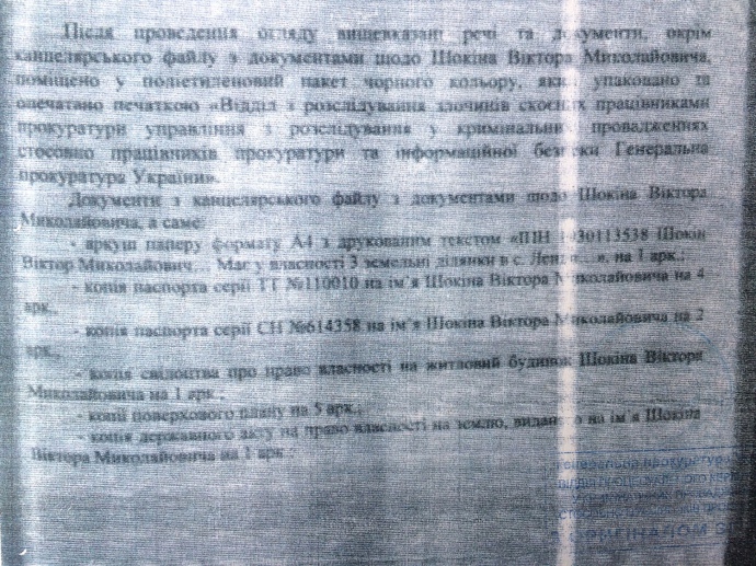 Крім того, серед вилучених документів був аркуш паперу з друкованим текстом, де вказується, ідентифікаційний номер Шокіна, зазначається, що він не є підприємцем і має у власності як фізична особа 3 земельні ділянки з 2001 року.