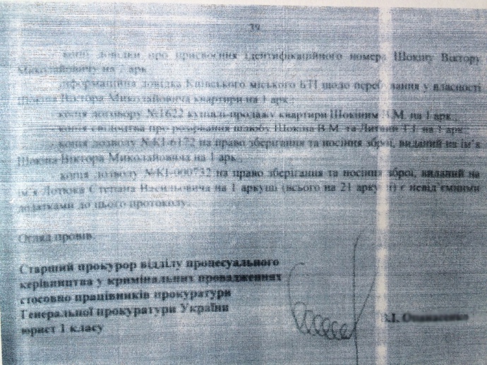 Також серед вилучених документів є копія дозволу на носіння зброї, видана на ім’я екс-прокурора Лотюка Степана Васильовича. Коли він був прокурором Києва, Шокін був слідчим з особливо важливих справ.