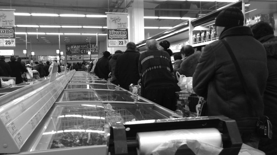 В одном из супермаркетов — огромные очереди. Стоять приходится три-четыре часа. Здесь до сих пор работали терминалы, а значит, еще можно было расплатиться карточкой.