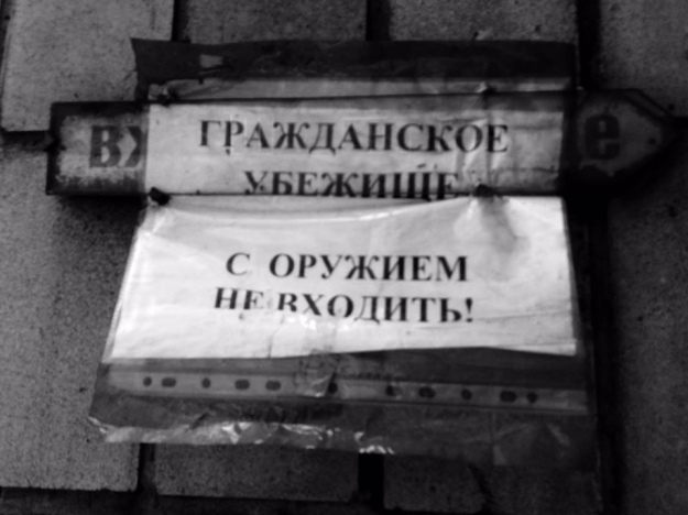 На входе в подвал встречает надпись: «Гражданское убежище. С оружием не входить».