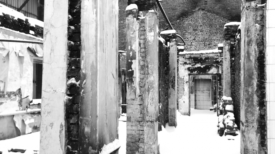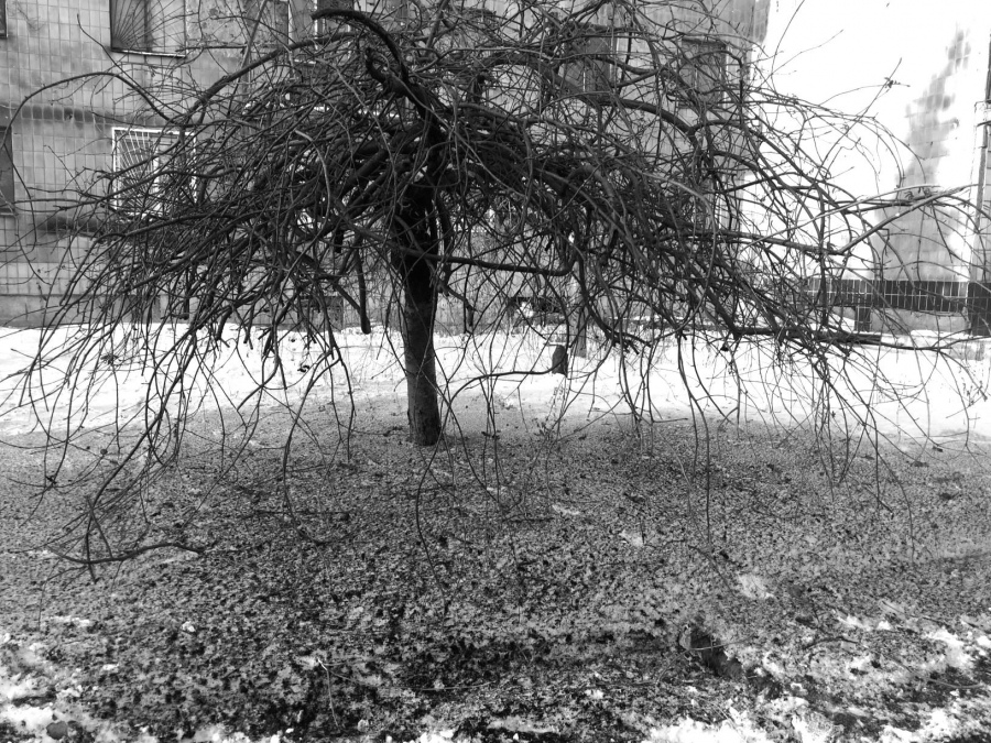 У психиатрической больницы на Петровского — снег черный, пепел после обстрела.