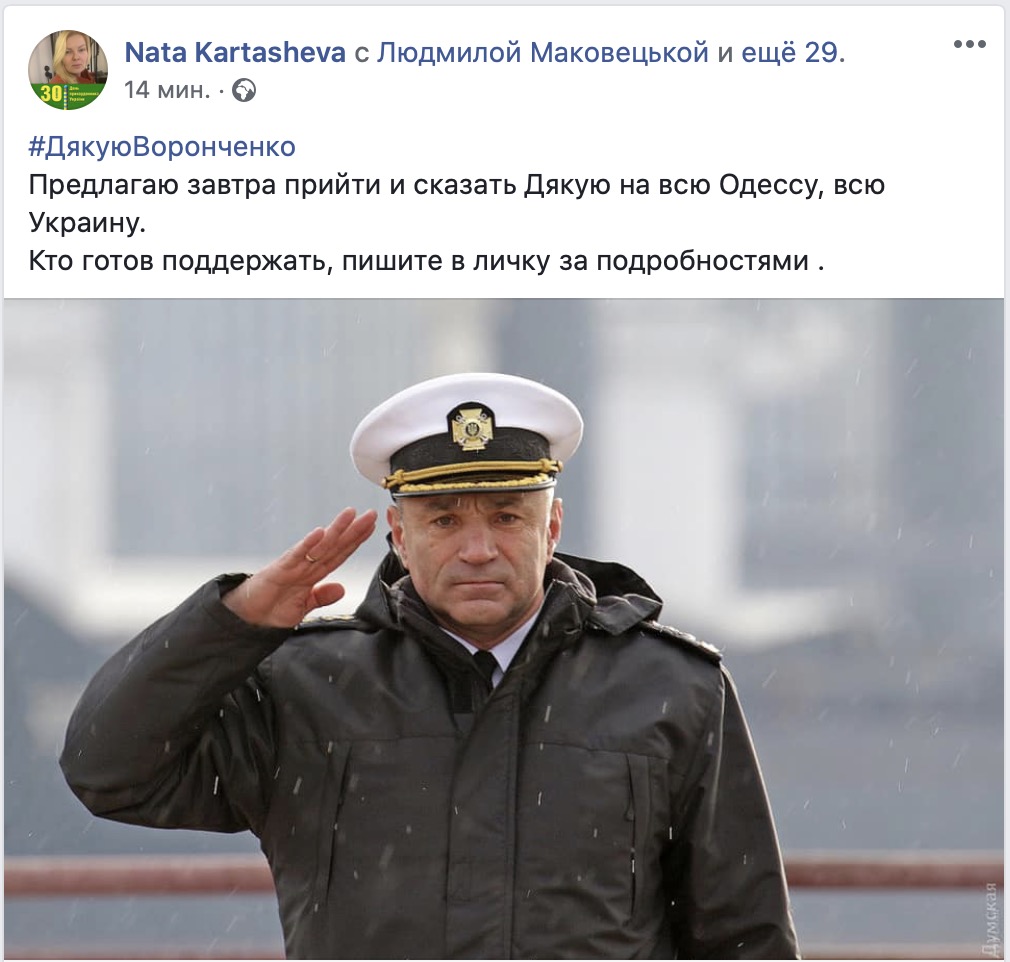 Волонтер Наталья Карташова призвала завтра прийти к штабу ВМС и поблагодарить Воронченко за службу.