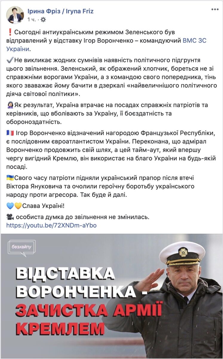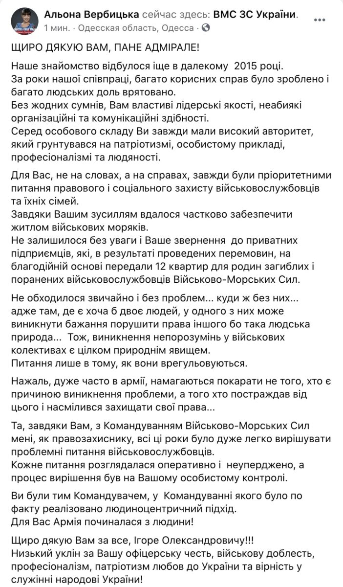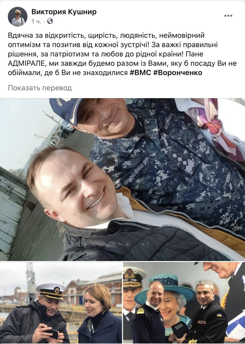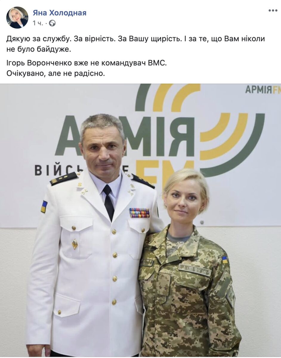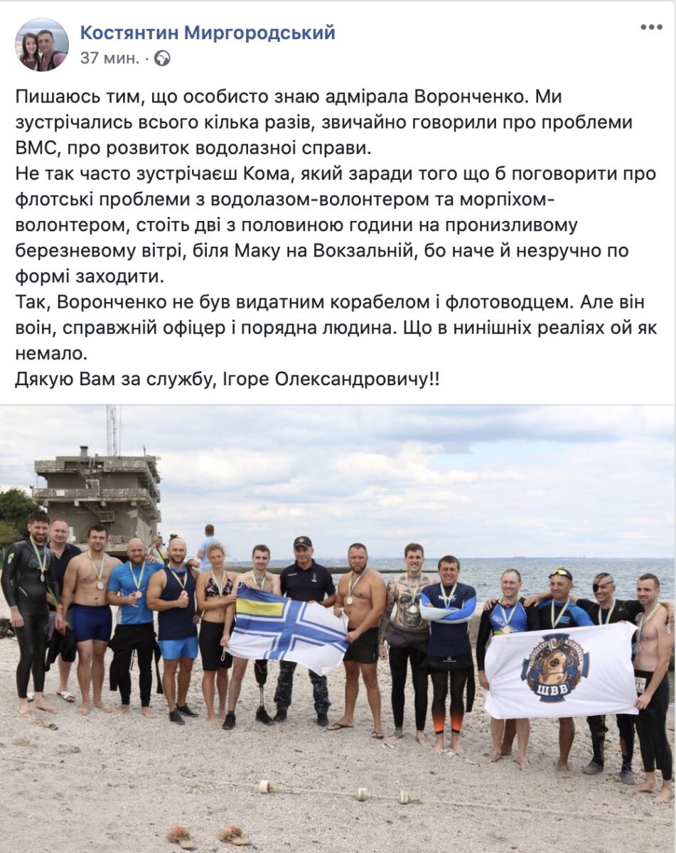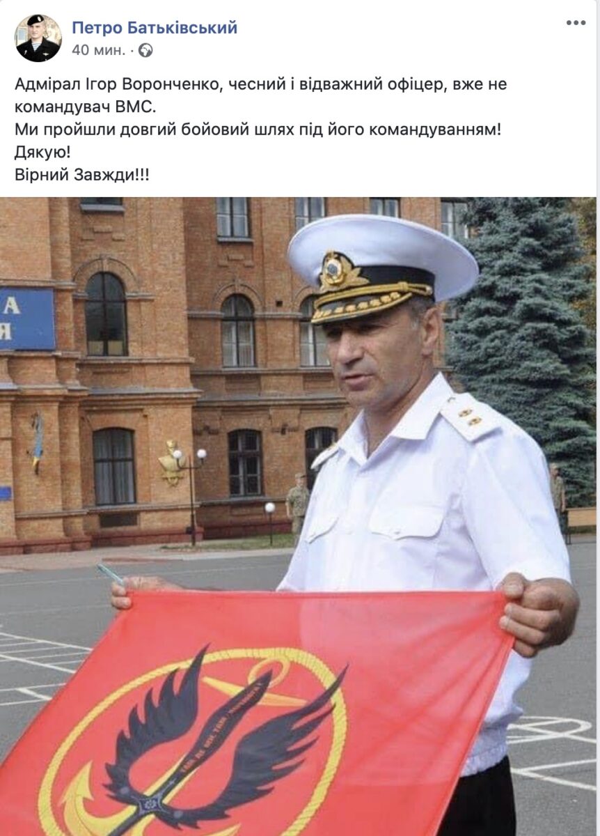 «Адмирал Игорь Воронченко, честный и отважный офицер, уже не командующий ВМС. Мы прошли долгий боевой путь под его командованием! Спасибо! Верный Всегда!!!»