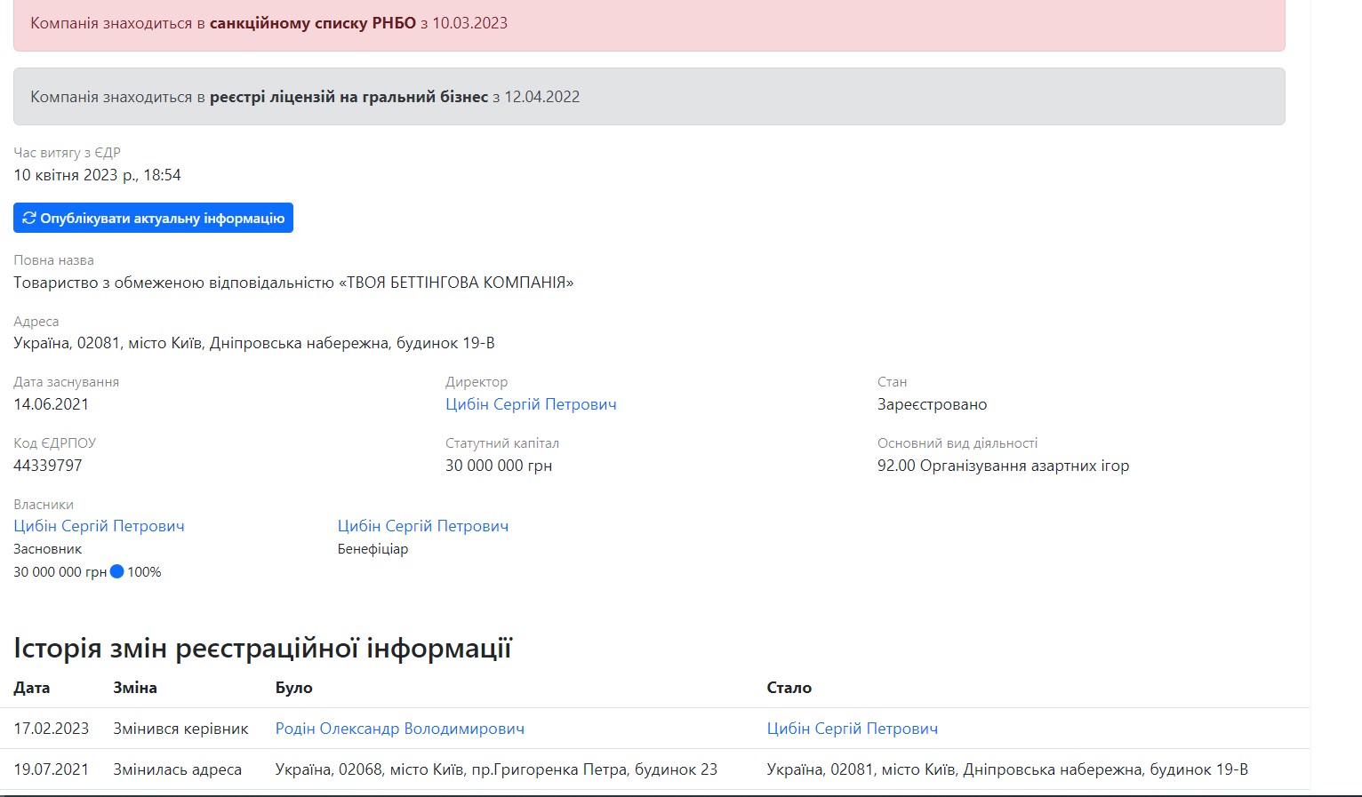 But let’s return to the chain further. In Techiia, the chief lawyer is Roman Rodin. His brother Oleksandr Rodin, until February 17, 2023, was the director of LLC "Your Betting Company":